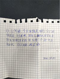护理病人是我的本职,但我觉得和病人交流相处更加重要。我能理解病人受病痛折磨,希望被理解被安慰的心情。那是一种渴望,像鱼渴望水,花朵渴望阳光。他们渴望着健康,因为家里还有时刻惦记着他,等他去守护的亲人。人之初,性本善,我相信通过心对心的交流,本着为他们排忧解难的心情,把他们当家人当朋友去相处,病人一定会理解支持我们的工作。在工作中我们时常遇到很多支持我们工作的可爱病人,他们以各种方式表达对我们的谢意,有当面道谢的,有给我们买水果的,有送锦旗的,也有像梁梓嫣小朋友这样写感谢信的。这确实让人很感动,这是一种肯定与认可,也让我们的社会价值有了更好的体现。