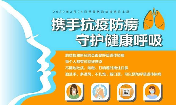 2020年3月24日 是第25个世界防治结核病日,今年我国的宣传主题是:“携手抗疫防痨 守护健康呼吸”。这个主题寓意着在当前我国新冠肺炎疫情防控取得重要进展的时刻,我们同时要关注另一种通过飞沫传播的慢性呼吸道传染病--肺结核,这也是当前严重危害人民健康的主要传染病,防治工作时不我待!