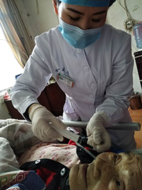 考虑到老人年纪大、出行困难,加之现时防控形势严峻,老人更不宜出门,院办公室登记好群众的地址、联系电话,安抚好患者家属并承诺实行护士上门服务。护理部根据患者情况,指派神经外科陈婷婷护士长前往患者家里开展护士上门服务。接到通知后,陈婷婷护士长与科室医师孟志勇,急忙赶往15公里以外的患者家中,并在路途中电话联系患者家属,告知初步的简单处理方案。