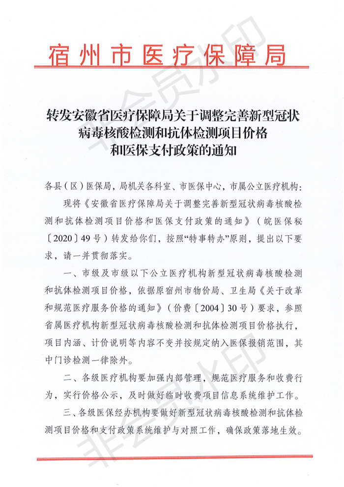 转发安徽省医疗保障局关于调整完善新型冠状病毒核酸检测和抗体检测项目价格和医保支付政策的通知