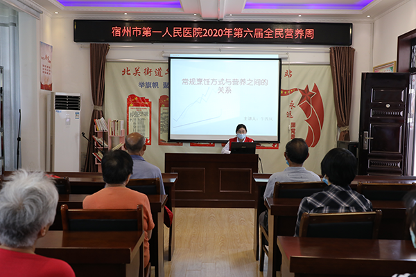随后,我们又来到社区会议室,通过电子屏播放《常规烹饪方式与营养素的关系》、《三减三建》等相关知识,并开展合理膳食的健康讲座,让居民了解更多的健康营养知识。