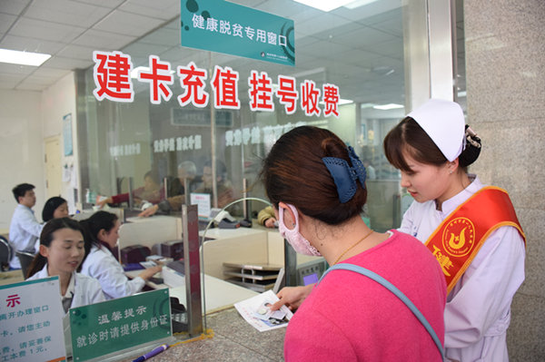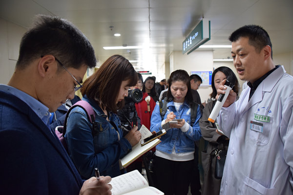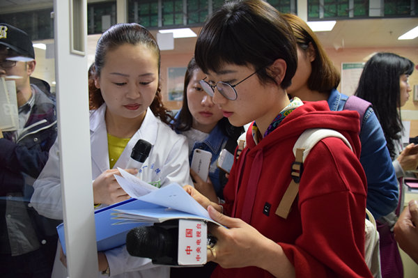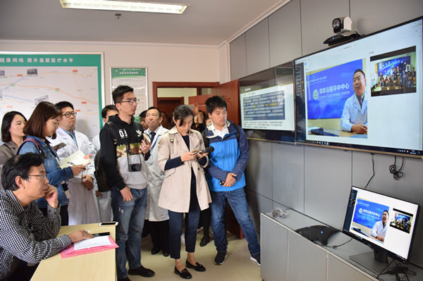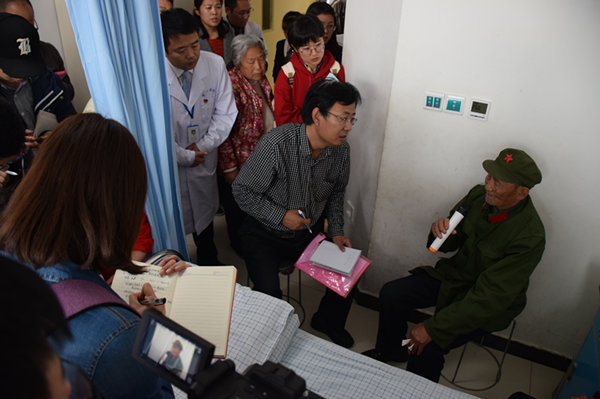 4月13日下午,安徽省委宣传部副部长范荣晖带领人民日报、光明日报、经济日报、中央人民广播电台、中央电视台、安徽日报等中央、省主流媒体组团来到我院,对我院健康脱贫工作进行集中采访、观摩贫困人口就诊绿色通道、健康脱贫病房、“一站式”结算窗口、贫困人口大病筛查和专项救治等,并采访了相关贫困患者,了解健康脱贫政策落实情况。采访团认真听取了孟令盘院长对我院健康脱贫工作的汇报,先后来到住院结算处、神经内科病区实地了解健康脱贫工作的开展情况,同时还参观了我院远程会诊中心及医疗服务共同体的工作情况。经过深入的了解,采访团对于我院健康脱贫工作给予了充分的肯定。