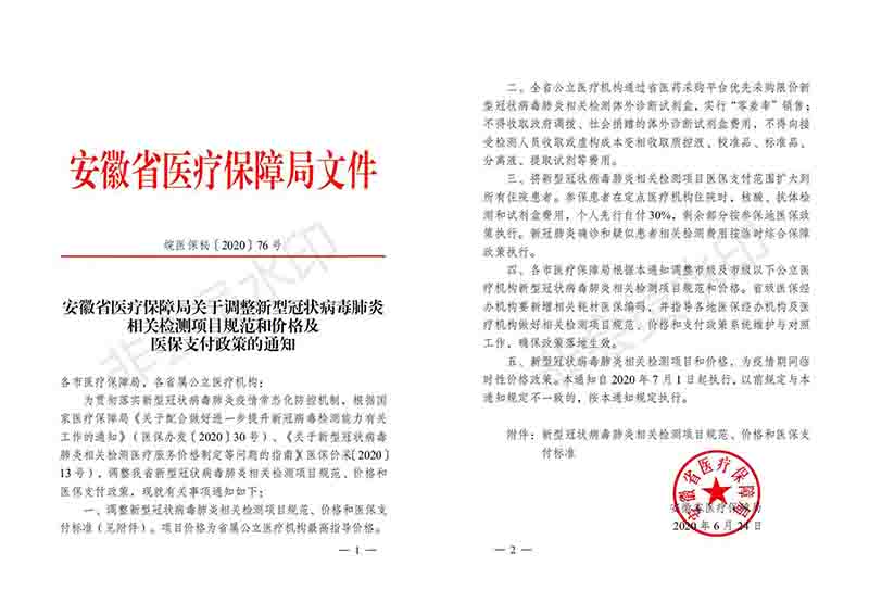 安徽省医疗保障局关于调整新型冠状病毒肺炎相关检测项目规范和价格及医保支付政策的通知