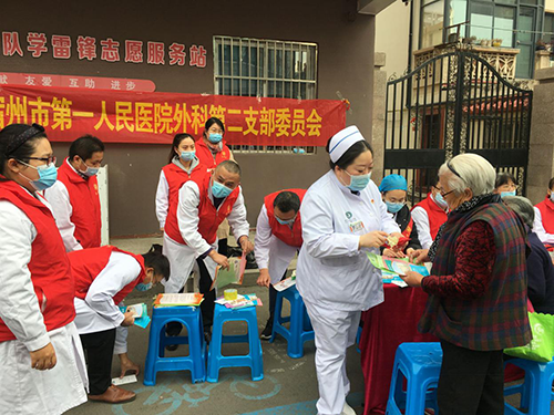 “情暖金秋,爱在重阳”,每逢秋高气爽、桂花飘香之时,又迎来了传统佳节重阳节。为大力弘扬中华民族尊老、敬老、爱老、助老的传统美德,让老年人在重阳节期间,能享受一次全方位的医疗保健服务, 10月25日上午,我院外科二支部组织部分党员,在华地社区志愿者服务中心门口开展义诊活动。