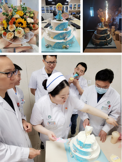 2021年5月12日是第110个国际护士节,清晨来到科室,耳边回荡着同事和患者们"节日快乐"的祝福,护士工作站的桌子上,几束美丽的鲜花映入眼帘,此时此刻,内心满满的感动。和往常的护士节一样,科主任和护士长给我们定制了节日蛋糕,大家一起欢度这个属于护理人的节日。这是我们科室成立的第六年,铁打的营盘流水的兵,时光飞逝,患者不断更换,医护人员队伍不断壮大,但不变的是“理解、包容、和谐、进取”的脑诊团队,感谢科主任和护士长对护理同仁们的关心,身为脑血管病诊疗中心的一员,自豪幸福充盈心间。在这个神圣的日子里,我想赞美一下我可爱的护理姐妹们,他们默默奉献,不辞劳苦,在平凡的岗位上奉献着自己的青春与智慧!
