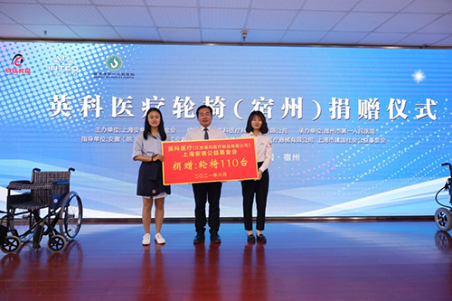 最后英科医疗携手安慈公益,为宿州市第一人民医院捐赠了110台轮椅,宿州市第一人民医院户学敏副院长上台接受捐赠。王秉璞书记致答谢词,对英科医疗以及安慈公益的善举表示感谢。