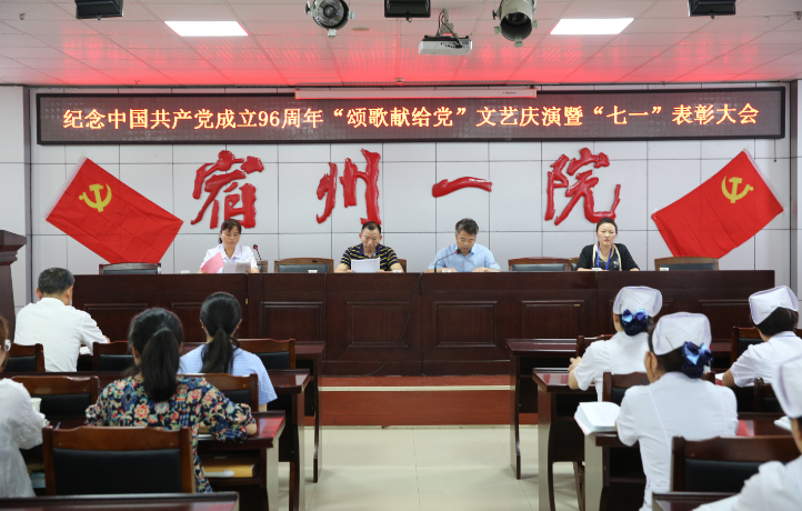 6月30日下午,宿州市第一人民医院党委在门诊楼八楼多功能会议室隆重举行庆祝中国共产党成立96周年“颂歌献给党”文艺庆演暨“七一”表彰大会。党委书记王秉璞、院长孟令盘、副院孙建田、李秀君、纪检书记支淑华出席,全体党员和中层以上干部200多人参加了大会。大会由纪检书记支淑华主持。
