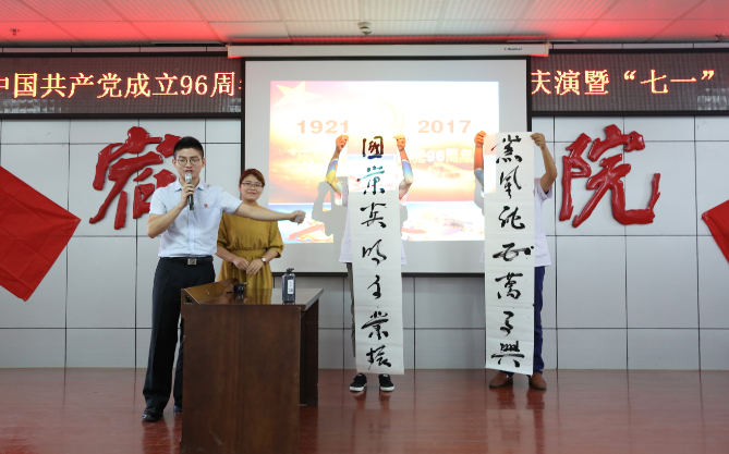 王丹妮《春天的故事》、陆登科《中国人》、蒋一飞《红旗飘飘》、吕明瑶《浏阳河》他(她)们豪迈的激情,嘹亮的歌声唱出了对党的无限忠诚、对祖国的美好祝愿;陈宝华葫芦丝表演《阿瓦人民唱新歌》、何金雨笛子独奏《我的祖国》旋律流畅,极富音乐性和音乐表现力,打动着现场观众;王晨露 蒋一飞演唱的《以人民的名义》、张丙英 秦强《为了谁》让人们仿佛看到了新时代共产党人托起中国梦,以光辉的旗帜继续指引我们奔向小康、走向新辉煌的壮丽图景;张勤书法表演“国策英明千业振,党风纯正万业兴”表达出我院新时代青年对伟大的党无限忠诚和崇高的热爱,铿锵有力的笔墨,赢得观众阵阵喝彩。演唱者紧扣“颂歌献给党”这一主题,抒发了对党对人民对祖国的无限热爱,歌手深情绵渺、激情高亢,为党的96华诞献上了一份厚礼。