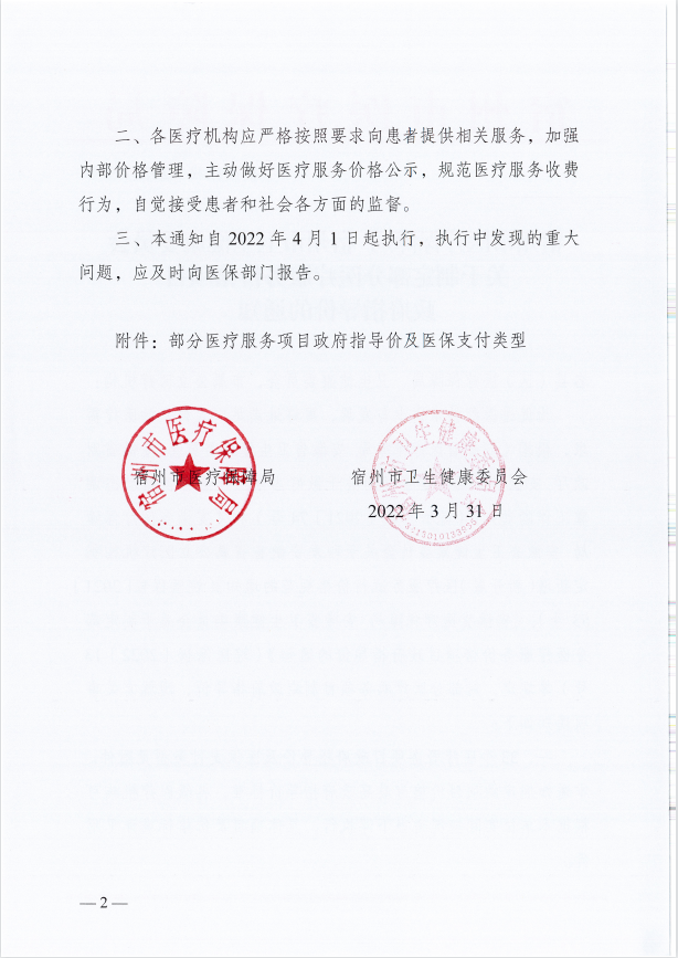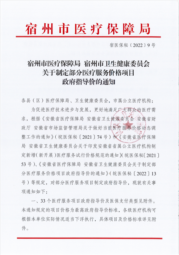 宿州市医疗保障局 宿州市卫生健康委员会 关于制定部分医疗服务价格项目政府指导价的通知