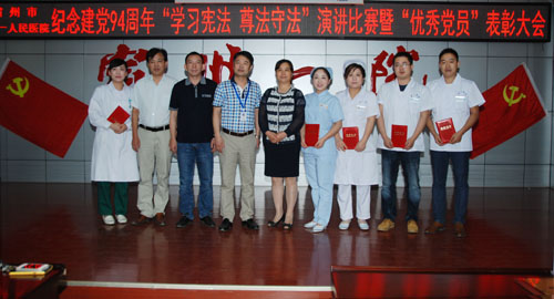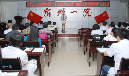 为庆祝中国共产党建党94周年,6月30日下午,中共宿州市第一人民医院党委举行庆七一“学习宪法、尊法守法”演讲比赛暨“优秀党员”表彰大会。院党委领导班子成员、全体共产党员、学雷锋标兵和入党积极分子共一百二十余人参加了大会。大会由党委委员、副院长李秀君主持。