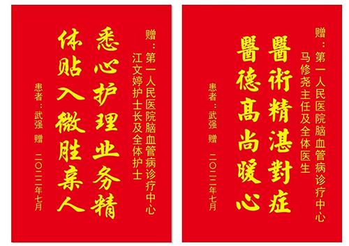 7月28日,患者病情稳定,准备转康复医院进行下一步康复治疗,患者家属所在小区解封后来到医院,将两面饱含感激之情的锦旗送到了科室,感谢全科医护团队在武先生住院期间的悉心治疗和护理照料。