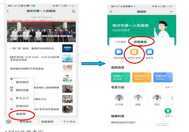 (3)点击微官网,进入后点击住院服务,选择住院日清单