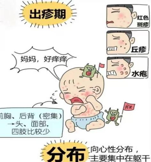 发热、全身不适、皮肤和黏膜成批出现周身性红色斑丘疹、疱疹、痂疹为特征的发疹情况。皮疹躯干部最多,伴有明显瘙痒感,呈向心性分布,头面部次之,四肢较少,手掌、足底偶见。自发病前1-2天直至皮疹干燥结痂期均有传染性。