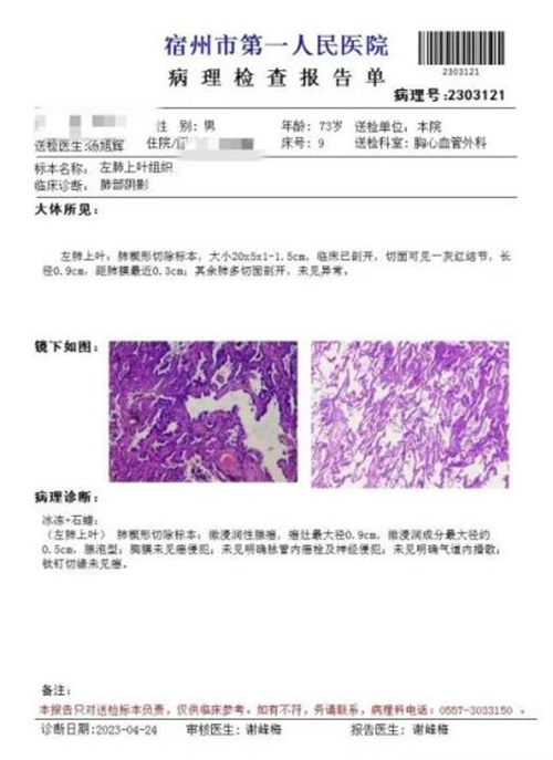 据医院胸心血管外科孔劲松主任介绍,该患者今年73岁,体检发现左肺上叶有磨玻璃结节,听说医院聘请了国内知名的张国桢肺部微小结节诊疗中心专家团队,便立即预约了专家团队会诊。