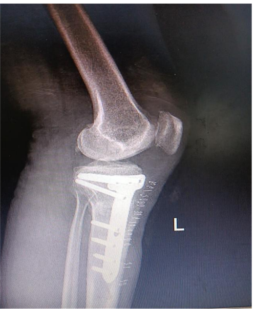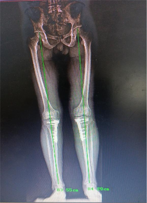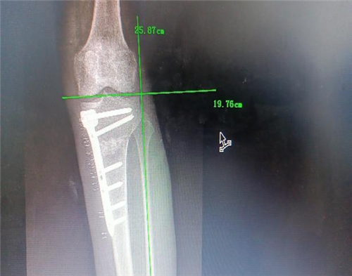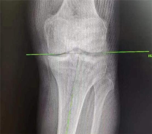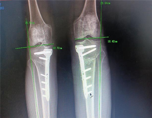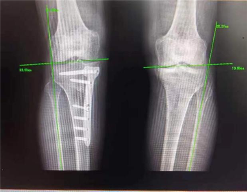 而近期患者感觉其左膝关节疼痛逐渐加重,伴随肿胀,甚至需要扶拐前行。因为患者对第一次手术效果非常满意,所以再次来到我院骨一科就诊。李强主任团队针对患者具体病情进行评估,发现患者负重位X线片显示左膝关节内侧间隙变窄,胫骨内翻,胫骨近端后倾角 76°,胫骨近端内侧角小于82°,左膝关节退行性改变。外侧间室及外侧关节间隙相对完好,测量后发现其畸形主要为关节内翻畸形。