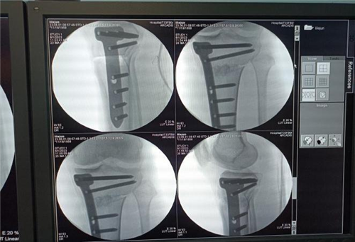 既往针对此类患者,多数医生可能会选择单髁置换手术。考虑到患者比较年轻,单髁(UKA)或者全膝(TKA)都存在不同程度的骨丢失,经过认真评估后,我院骨一科李强主任团队决定选择保膝治疗-胫骨结节下单平面高位截骨术(DTT-HTO),通过手术适当纠正下肢力线,将膝关节负重中心外移,来改善症状,延缓患者关节置换的时间或者避免关节置换。