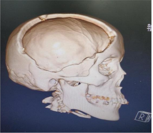 1、自体颅骨修补术前,去骨瓣术后3个月颅骨三维CT: