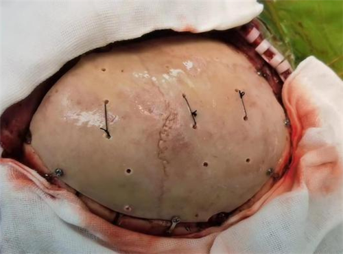 患者吴女士,三个月前因车祸伤后颅内多发出血,脑疝形成,我院急诊行开颅血肿清除+去骨瓣减压术。当时右侧的颅骨已做了去骨瓣减压处理,因外伤后会出现脑肿胀,术中是不允许将颅骨安置回去的。考虑到右侧颅骨有较大的缺损,将会对以后的工作和生活造成影响,我院神经外科专家建议家属将离体的颅骨进行专门的低温保存,等其病情稳定后,施行自体颅骨回植手术。