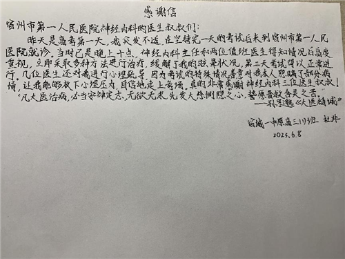 6月8日,就在高考结束的当天,我院神经内科一病区收到了一封特殊的感谢信,写信人是宿城一中一名刚刚参加完今年高考的高三年级学生,高考结束后,他第一时间对我院医护人员表达了感激之情。
