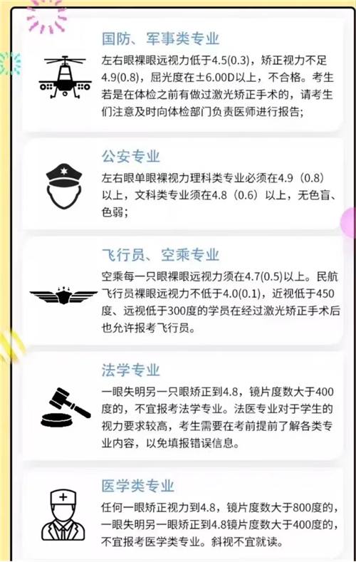 第一:为什么说高考后是近视手术的最佳时间?往年,有不少考生选填对视力有要求的专业和岗位,等到体检前夕才急着来做近视手术,但在术前检查中却发现有急性结膜炎、眼底裂孔等问题,需要控制以后才能手术,结果错过了体检时间,前功尽弃。这样的例子每年都有发生,非常可惜!1.迫在眉睫的专业需求