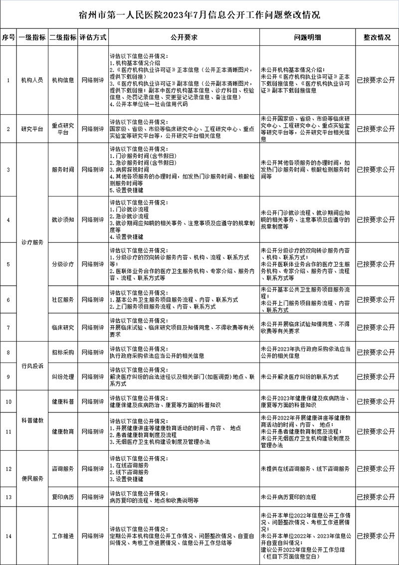 宿州市第一人民医院2023年7月信息公开工作问题整改情况