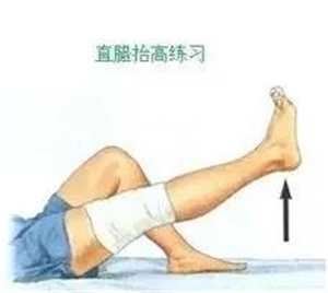 3.直腿抬高训练:取仰卧位,患侧下肢在伸膝状态下,将大腿抬离床面20-30公分,保持5秒,再恢复至起始位,(10次/组,每日5组)