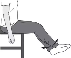 2.坐位膝关节屈曲伸展练习;坐于床边或椅子上,小腿自然下垂,尽可能用力屈曲膝关节直至足部接触地面,坚持5-10秒后完全伸直膝关节,或用健侧膝关节屈曲力量缓慢辅助患侧膝关节屈曲,保持5-10秒伸直。(每次锻炼10分钟,每日3组)