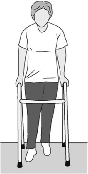 4.扶拐步行训练:患者扶助行器进行步行训练,使用三点步态,即先出助行器,再迈患侧,后迈健肢。(10-15分钟/次,2-3次/天)