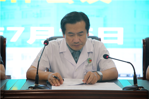 随后,孟令盘院长进行重要讲话,他强调医院高质量发展的过程中,教学工作和医疗工作要同等重视,共同发展。要将学生安全问题放在第一位,通过“一线临床医生授课、病房内实践与理论教学、零距离实训中心实操强化”等教学模式改革,有效提升人才培养质量。同时,对教研室和科教科提出了三点要求和希望,一是在提升教学能力的前提下,充分发挥主观能动性,医教研协同发展,转变陋习,清醒认识教学方面的不足,努力提升科教水平。二是立足三级公立医院绩效考核,人才梯队建设,不断提升教学能力,提高病区教研室临床转化率。三是立足三级甲等医院创建,推动医院高质量发展。科教科做好督促各教研室教学工作的具体落实,要早谋划、勤部署、抓落实,确保本次教学班的入住、开课有条不紊,确保临床教学工作的具体落实。