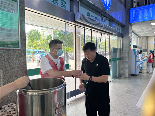 活动现场,“男丁格尔”的志愿者们不仅为前来就诊的患者和家属分发了印有防暑降温宣传的小扇子、科室文化宣传袋并向大家普及了防暑降温的应急知识以及夏季健康的生活理念。宣教的同时,志愿者们还将现煮的绿豆汤分装到一次性杯子里递到患者和家属的手中。