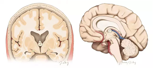 患者术前头颅磁共振平扫+增强检查考虑三脑室内胶样囊肿可能(不排除血管源性疾患可能)。胶样囊肿位于三脑室内,紧邻室间孔,约占颅内占位的0.5-1%,实属罕见,这些囊肿起源于原始神经上皮(旁突体成分) 的异常折叠,因囊内含有粘稠的胶样液体状物质这一特性而得名。胶样囊肿可长至一定体积,罕见情况下甚至引起室间孔的突然堵塞,导致危及生命的急性梗阻性脑积水。梗阻的原因可能与囊内突发出血、腰穿后肿块的移位或者分流失效相关。在大多数病例中,胶样囊肿并无临床症状,多为偶尔发现。