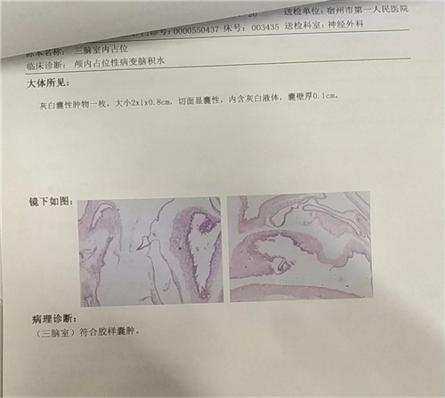 术后病理检查,也证实了该患者为颅内的罕见良性肿瘤——胶样囊肿。术后患者恢复良好,无明显手术并发症,头疼头晕症状消失,记忆力较术前明显改善,现已治愈出院。