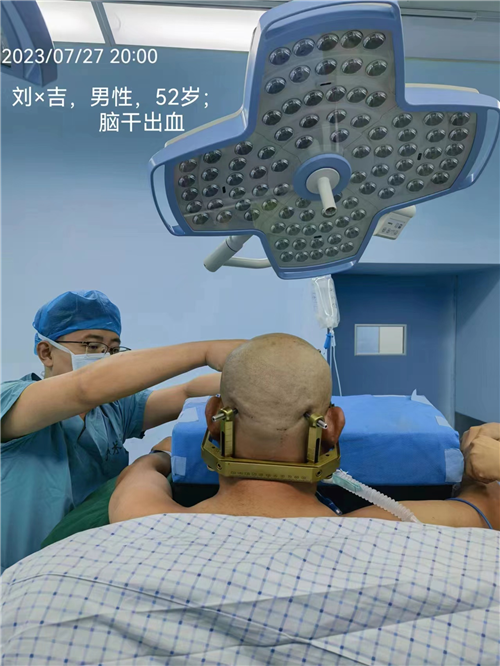 但是,这种情况如果放弃手术治疗,无异于放弃患者的生命。脑血管病诊疗中心马修尧主任在了解到刘先生的情况后,得知刘先生今年才52岁,还很年轻,是家里的“顶梁柱”,如果放弃手术治疗,这个家庭将遭受沉重的打击,家属也有手术意愿。马主任在全面评估患者病情后,认为手术治疗虽然风险非常大,但也并非没有一丝希望。经过与家属深入沟通,详细说明了手术治疗的意义、可能出现的风险和后果,在取得家属的信任和同意后,马修尧主任率领团队决定闯一次“生命禁区”,向神经外科领域最高难度的手术发起挑战,为患者和他背后的家去拼那仅有的一丝生还的希望。
