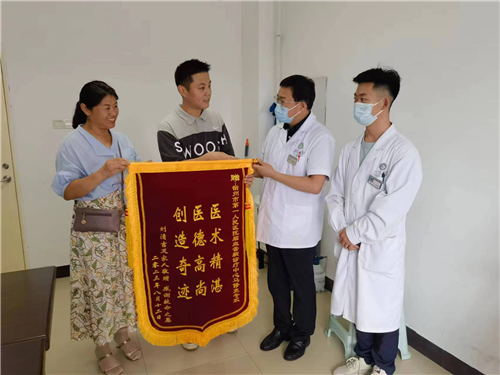 “手术很成功,但这只是第一步,接下来我们还有硬仗要打,那就是让他早日苏醒过来。”马修尧主任向家属表示,跨过“鬼门关”后还需要精心的治疗和护理。因为刘先生脑干出血量大,家属本以为他要在重症监护室待很久,结果没想到的是刘先生术后恢复良好,在脑血管病诊疗中心团队的精心护理下,很快就转到了普通病房。两周后意识逐渐恢复清醒,可遵嘱张嘴、伸舌、活动手脚,现已转回当地医院进行康复治疗。刘先生家人向脑血管病诊疗中心送来了锦旗表示感谢。