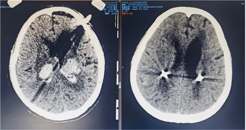 家住山东省滨州市的刘先生,在宿州市工作的时候,突然意识丧失、昏迷不醒,朋友立马拨打了120急救电话将其送到我院。紧急入院后,急诊科医生检查发现患者头颅CT提示脑干大量出血,出血量已超过10毫升,患者呈重度昏迷状态,病情危重,自主呼吸节律极为紊乱,急诊予紧急插管上呼吸机,为进一步抢救治疗,收住神经外科重症病区。