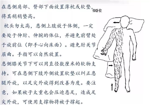 1、仰卧位时,患侧肩胛骨下垫枕,使其处于前伸位,肘关节伸展,前臂旋后,腕关节和手指伸展。