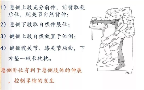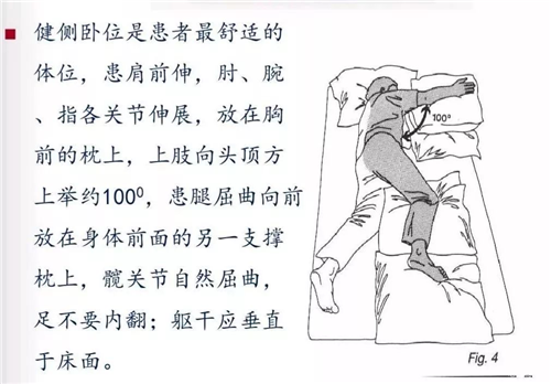 2、健侧卧位时,患侧肩和上肢充分前伸,肘关节伸展。