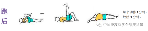 ②核心力量训练:臀桥,仰卧位,双脚打开与肩同宽,注意维持骨盆稳定。吐气时抬起腹部,吸气臀部慢慢下落。注意骨盆抬至与腹部一条直线即可,不要过分往上顶,重复12-15次。