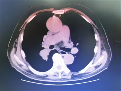 术前胸部CT:肿瘤累及中间段气管紧邻上叶气管
