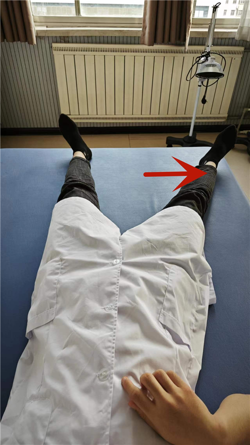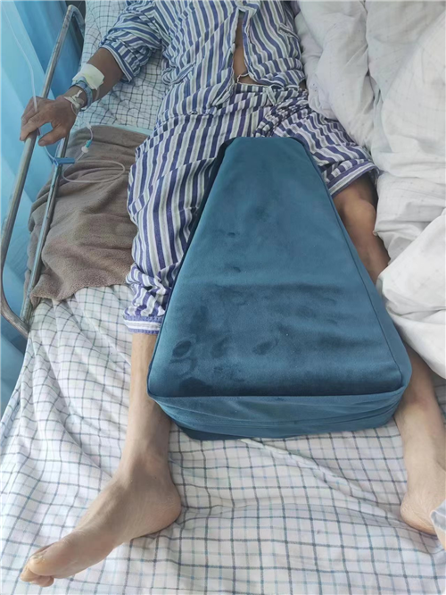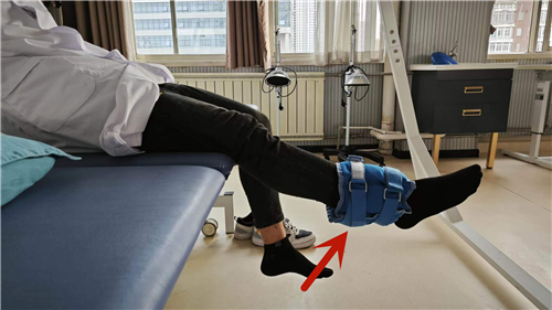 3.下肢活动训练:在仰卧位下,脚跟沿床面往臂部方向滑动,到小腿屈曲至45°停住保持5秒,再缓慢将小腿沿床面伸直。10个一组,每次做3组,每天2次。