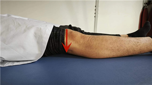 2.股四头肌等长收缩:在仰卧位下,绷紧大腿前方肌肉,将膝盖往下压紧床面,保持10秒,缓慢放松。10个一组,每次做2组,每天2次。