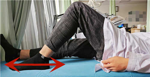 4.髋关节外展活动训练:在仰卧位下患肢沿床面缓慢水平往外侧打开,再缓慢收回。10个一组每次做2~3组,每天2~3次。(早期大腿内收不要超过人体正中线)