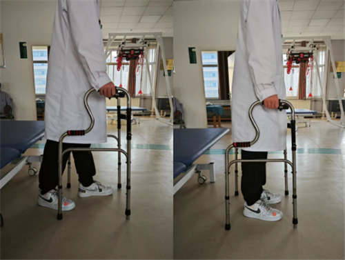 7.扶拐步行训练:患者扶助行器进行步行训练,使用三点步态,即先出助行器,再迈患肢后迈健肢,扶拐步行训练为10-15min/次,2-3次/天。