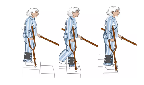 双手撑住腋杖 → 好腿先上台阶,站稳 → 双侧腋杖和患肢一起跟上,站稳