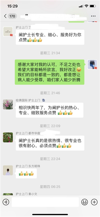 “今天降温,天气特别寒冷,感谢阚护士长一早上门,为家中老人换胃管并抽血,这种零距离、有温度的温馨优质服务值得点赞。同时也感谢第一人民医院热心为民办实事的便民服务,用实际行动诠释了全心全意为人民服务。”12月15日,一位通过微信下单预约了宿州市第一人民医院 “护士上门”服务的患者家属,通过微信对护士长阚家林表达了感谢与肯定。