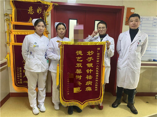 患者郭某,自诉三天前吹冷风后出现左侧口角歪斜、左眼闭合不全、左侧额纹减退、左侧颊部塞饭、左侧耳后疼痛等不适。来到我院康复医学科后,医生针对其症状,为其制定了详细的康复方案。经过一段时间的针灸、推拿、艾灸等综合康复治疗后,患者郭某的症状得到了明显改善。为此,特意给康复医学科送来了锦旗表达对科室医务人员工作的肯定。