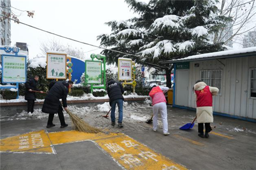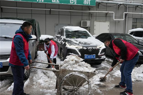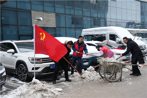 一名党员,就是一面旗帜。在党员干部的模范带头下,志愿者们齐心协力破冰除雪。零下十度的清晨在这里却是变得热火朝天,他们分工明确、包片作战,很快清除完了院区内道路冰雪,为就诊患者开出一条安全通畅的“暖心通道”。