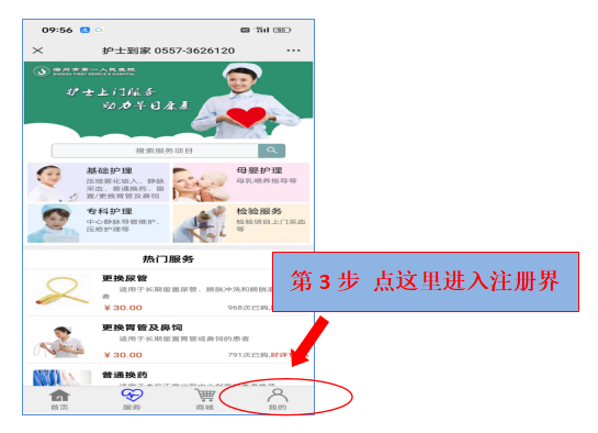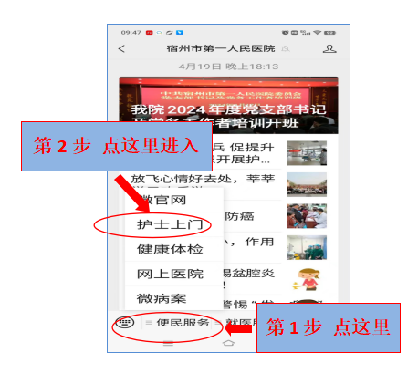 1、首先请关注“宿州市第一人民医院”公众号,进入公众号页面下方点击菜单“便民服务”→“护士上门”,如下图: