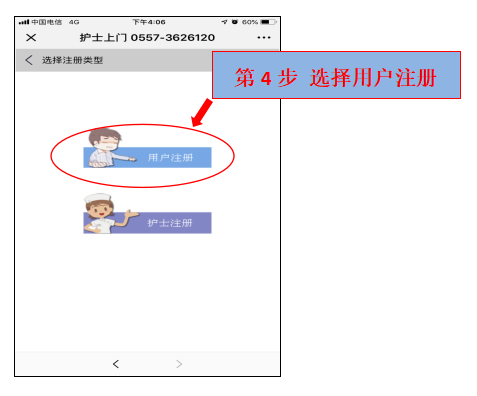 3、选择“用户注册”,注意,如果你是用户,请不要选择“护士注册”。