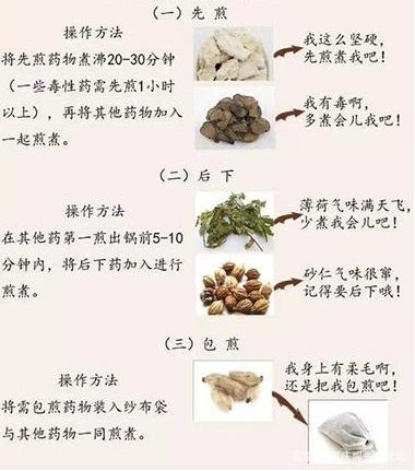 (6)煎煮方法:一般来讲,解表药、清热药宜武火煎煮,时间宜短,煮沸后3-5分钟即可;补养药需用文火慢煎,时间宜长,煮沸后再续煎30-60分钟。